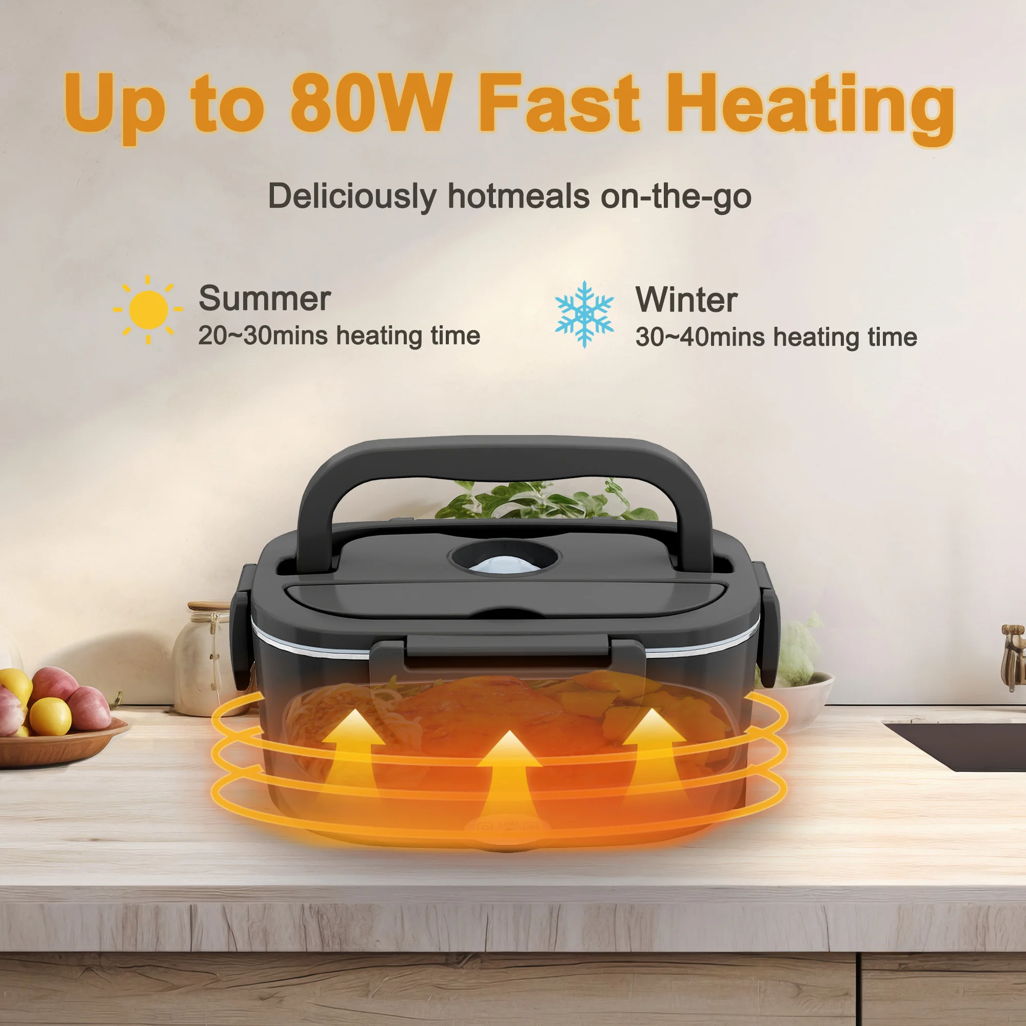 230V/12V/24V: home and car double voltage 230V/12V/24V 80W. With this lunch box, you can heat food anytime and anywhere without the need for a microwave. (Make sure the heating plate and cords are dry before heating.)